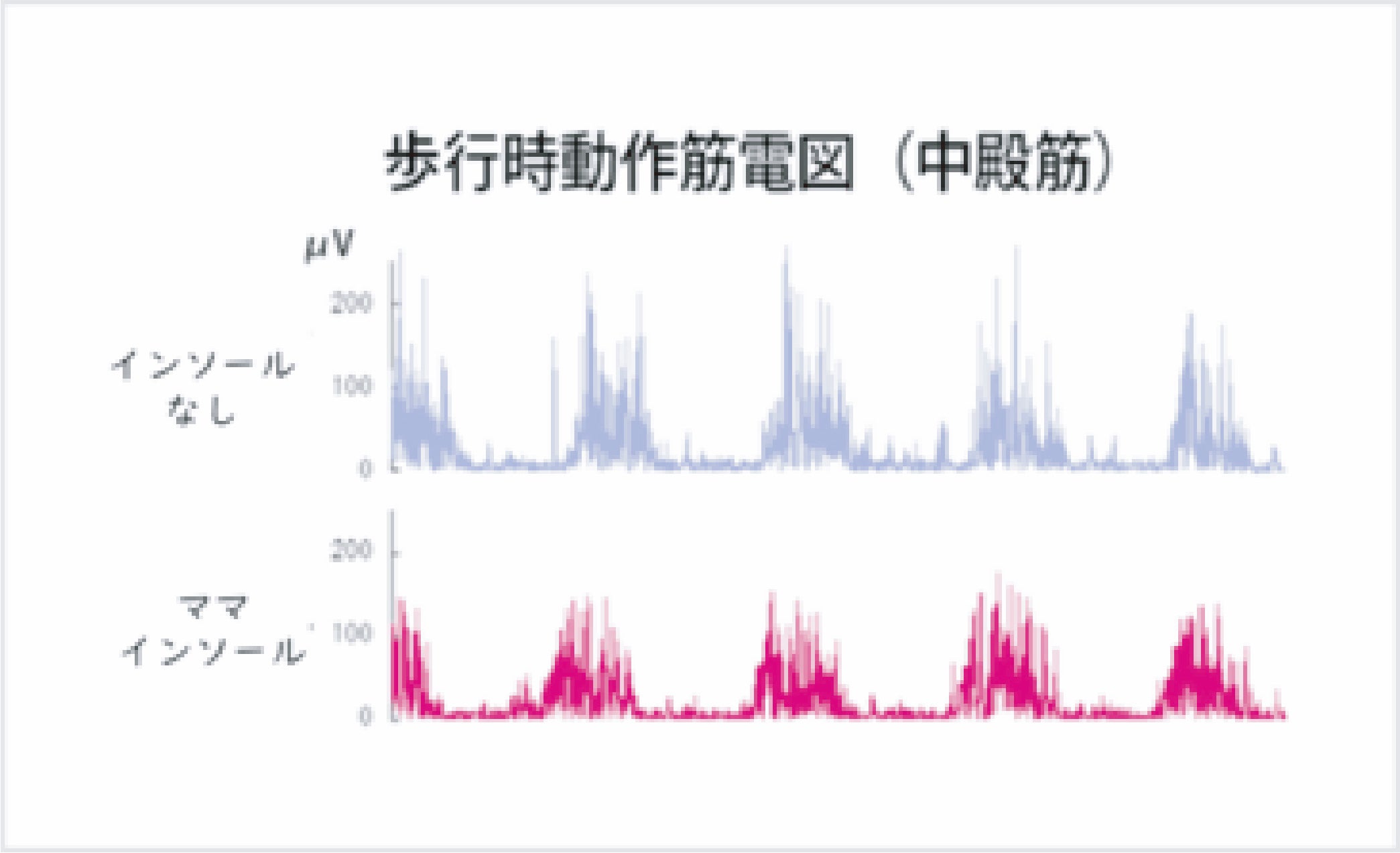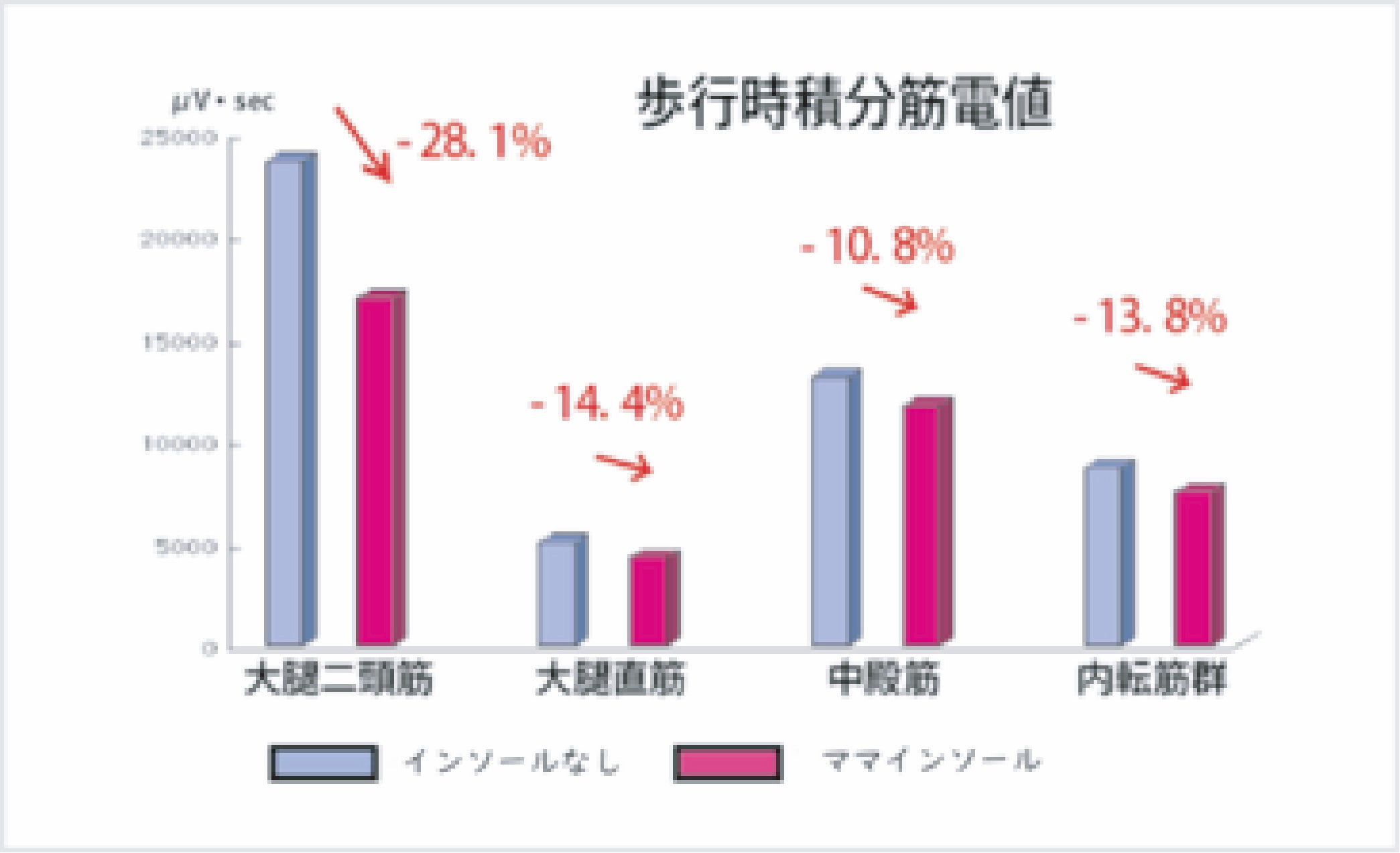 ママインソールを履いた時に、通常と比べ筋活動量が減少し、足の負担が軽減されました。歩行時に使用する代表的な足の筋肉を比較したところ、10.8%~28.1%分ほどの効果が出ています。